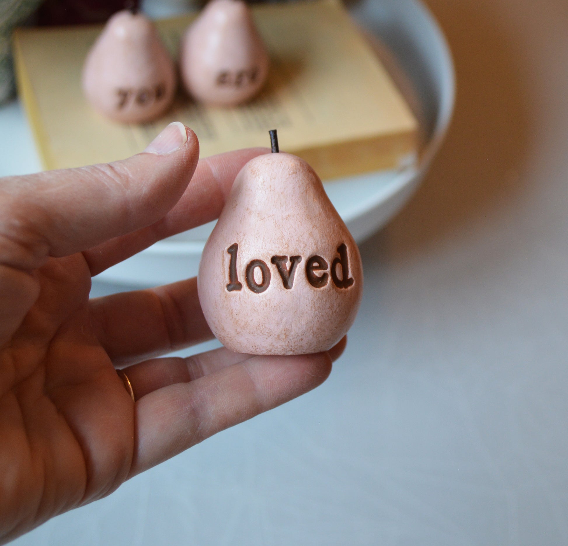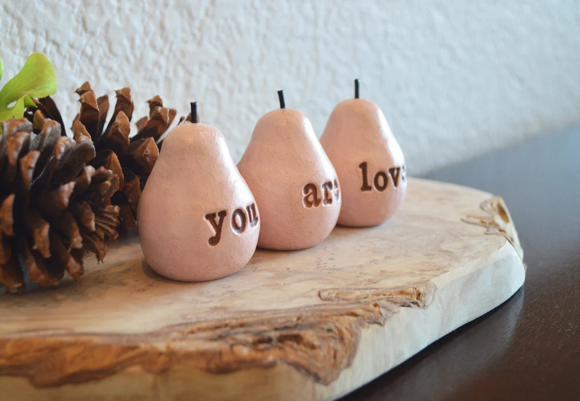 Crafted from high-quality clay, these adorable pears have a smooth and earthy texture, providing a charming touch to any space. The embossed text adds a heartfelt sentiment, making these pears a perfect gift for birthdays, or simply to show your appreciation and love.